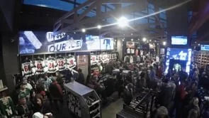 We partnered with Minneapolis-based artist HOTXTEA to create an art installation as the center piece of the jersey wall. The artist was challenged to substitute his usual medium of yarn for hockey laces to create a one of kind work of art utilizing Minnesota Wild colors.